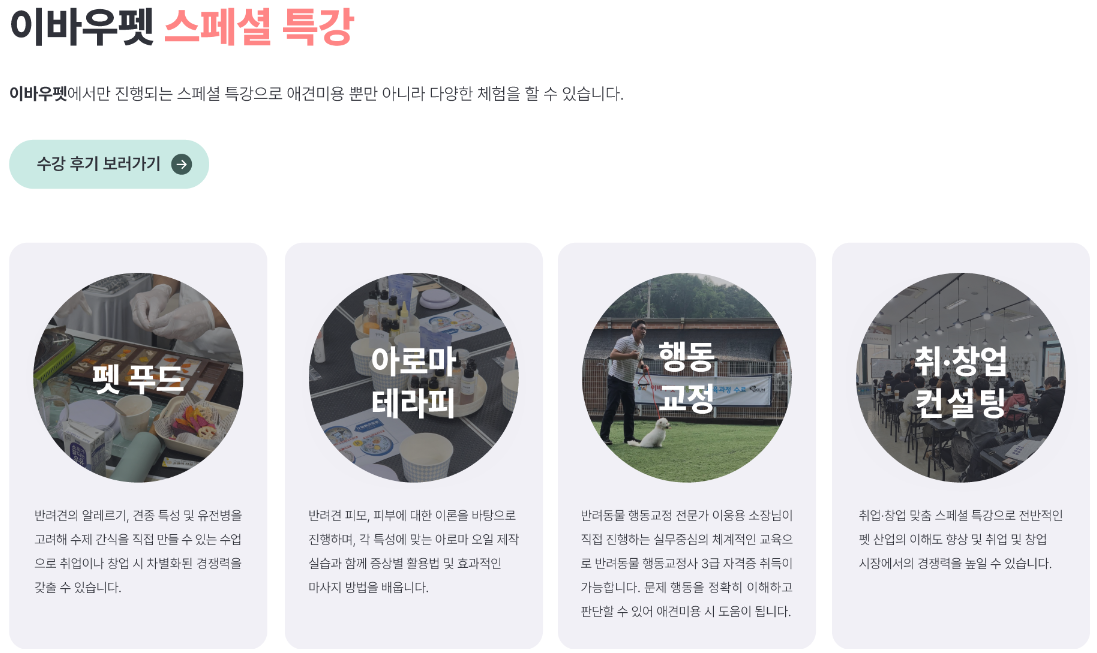 이바우펫에서는 단순한 미용 기술 외에도 펫푸드 제조, 반려견 행동교정, 아로마테라피 등 다양한 특강 프로그램을 운영합니다. 이는 애견미용뿐만 아니라, 반려견 토탈케어 전문가로 성장할 수 있는 기회로 연결됩니다.