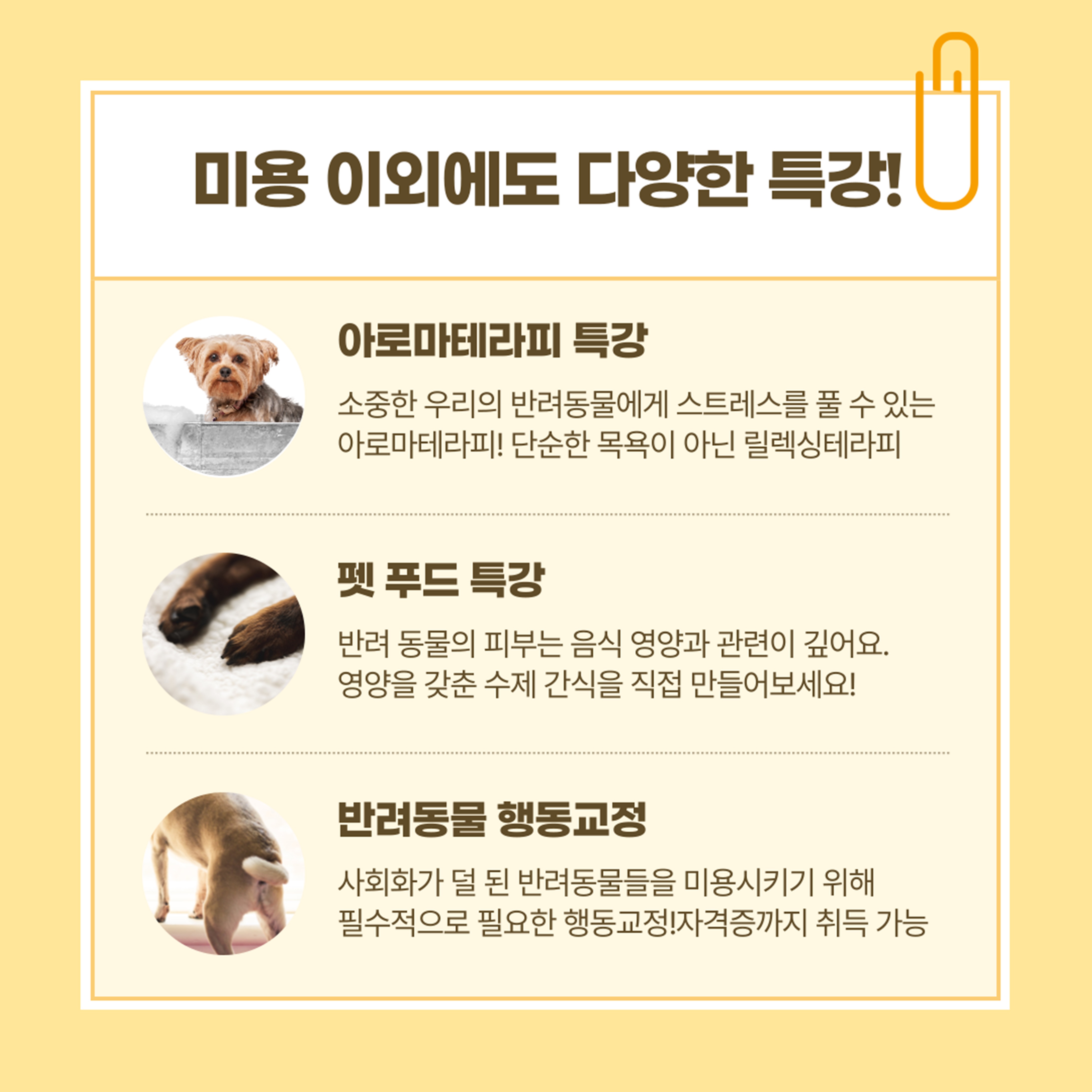 - 단순 미용 기술을 넘어 애완동물 전문지식 습득 가능