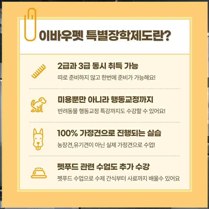 - 단순 미용 기술을 넘어 애완동물 전문지식 습득 가능